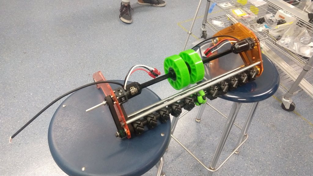 In addition to building the robot, build also worked on finishing the intake prototype (prior to putting the mecanum wheels on the actual intake). They were able to test it now from two sides and with a cutout of sorts in the middle for the ball to go through. Although the build kids did not test jamming with multiple balls (which was the original purpose of this), they were still able to prove that one ball can smoothly go through. We should, in any case, still be able to test ball jamming in a couple days with the actual robot.