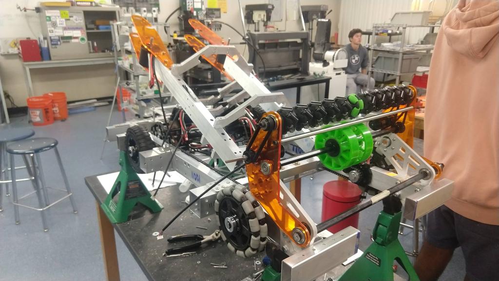 At the end of the day, we ended up being able to basically finish all the pieces for the tube, tube adjustment, and intake, with a few exceptions. Various sizes of hex shaft for the intake and tube were cut out of hex stock with a hole in the middle but were never tapped. This will have to be quickly done first thing on Monday so that assembly can continue. However, despite this, progress was great. The intake was completely assembled (but not attached to the robot) and the tube is about halfway assembled. Because of the extra time we are getting all throughout the week to work, we will be able to finish assembly (and hopefully also be able to wire the robot) on Monday.