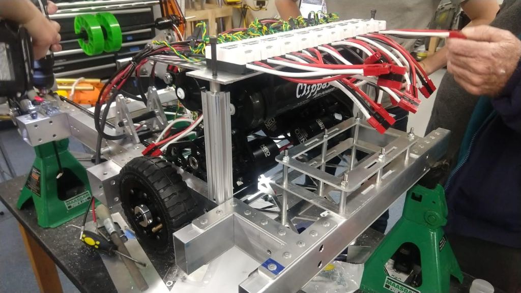 Electrical also had a lot of progress the last couple of days. The electrical board was finished and mounted to the robot (as you can see above). As soon as we attach the tube (which should hopefully be tomorrow) we will get the intake and tube wired (total of 7 motors) and hand off to software for testing. If need be we might also have to add some weights to simulate the weight of the climber (for software to test with the right weight) but it shouldn’t be a big problem.