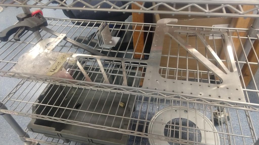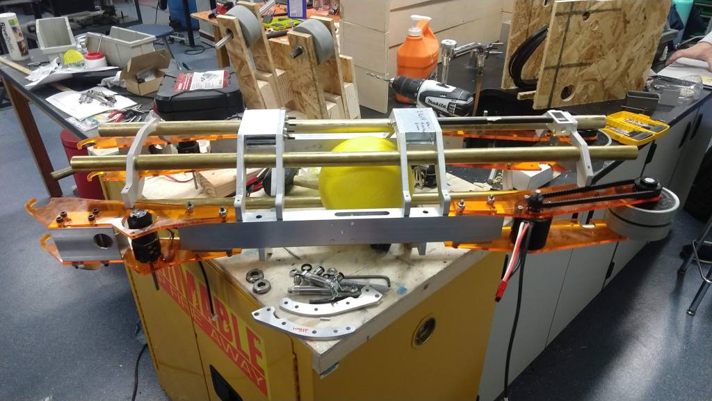 Over the past couple of days we’ve continued working on finishing up climber pieces as well as completing, testing, and attaching the tube and intake onto the chassis. We were able to get the shooter and intake plates for the tube attached on Tuesday and some of the wheels and motors that go along with that as well. We also worked on welding the polycord together and attaching it along the length of the tube (a process that required a good amount of force). All in all, the tube was finished before 6pm yesterday.