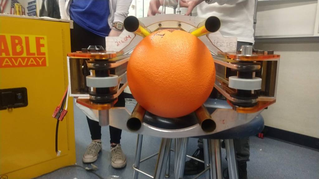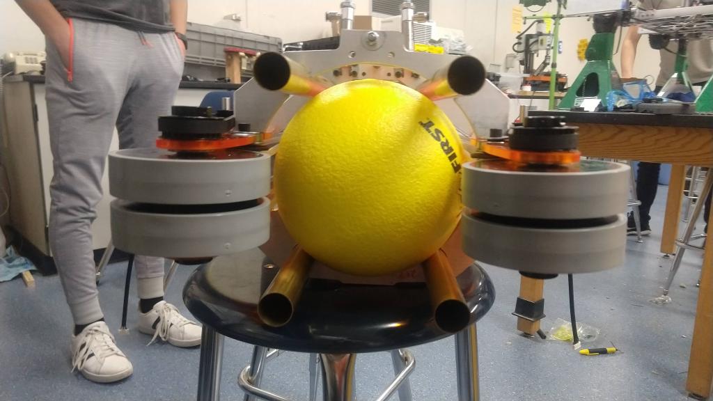 At the general meeting yesterday we were also able to use the completed intake to Frankenstein it to the electrical system. We wanted to test out whether the compression on the balls was right for shooting them out. It turns out that Gary’s eyeballing seemed spot on. The balls shoot out fine and it doesn’t seem like adjustment will be necessary. In addition we tested the belt system using some drills and, if both sides are powered at the same speed (which they will be with motors), it will work perfectly.