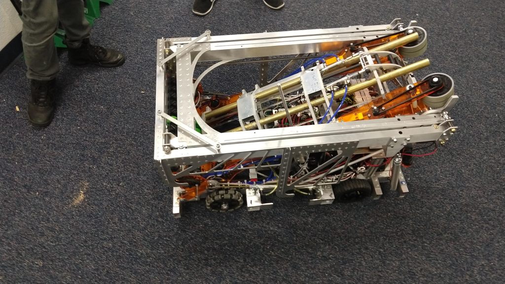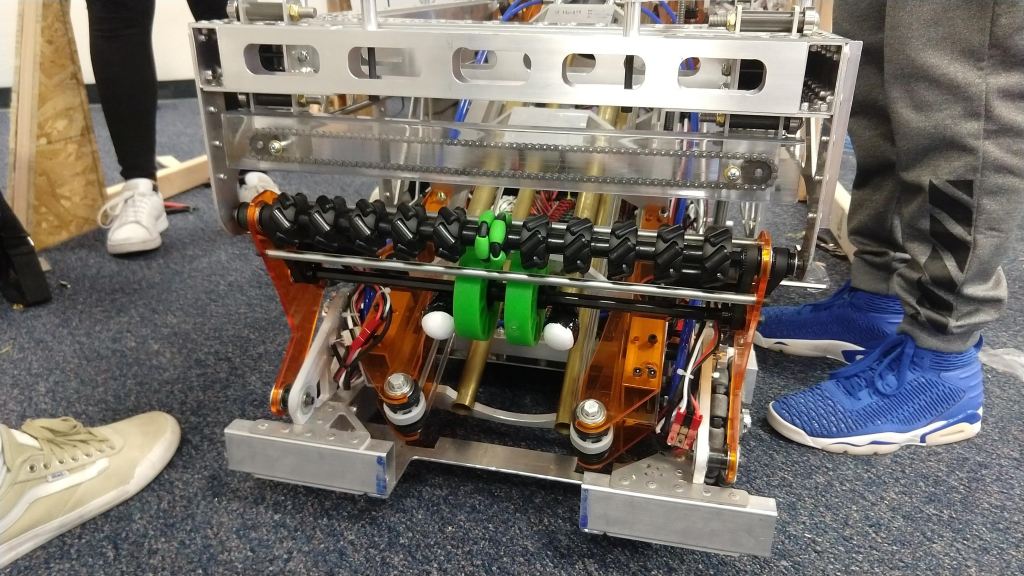 We were also able to put the robot on the climb bar using the hooks but not powering the motors (because we didn’t have software there). We initially tested it out on the level bar and that worked out perfectly. The robot doesn’t swing out much and if the motors are able to lift it, we should be able to have a quick and efficient climb.