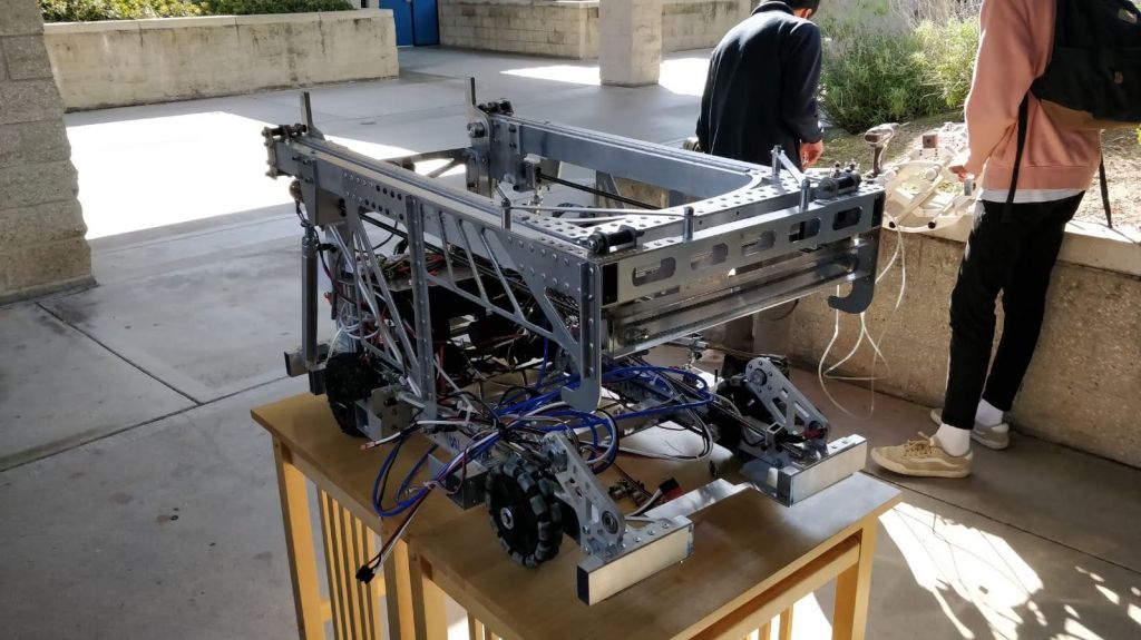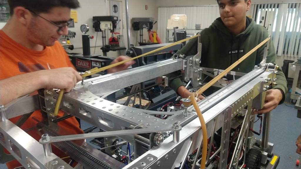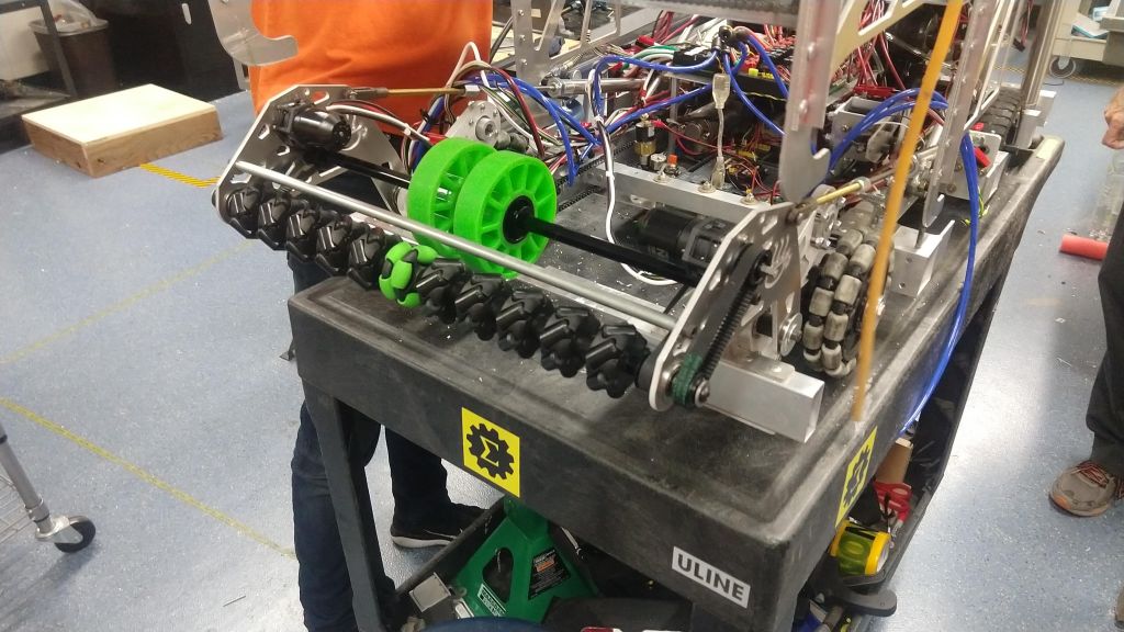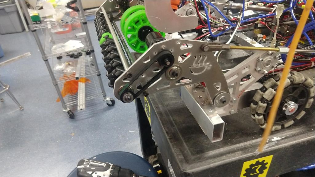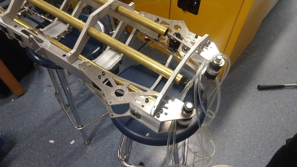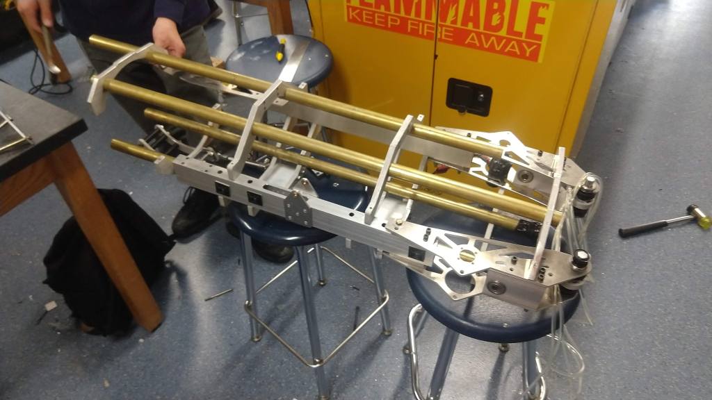 Today we started our “pit stop.” The plan was to finish Wednesday after school but we seem to be ahead of schedule. Today the robot was disassembled (excluding the climber and drivetrain) in order to change out the acrylic plates we had for prototyping. The electrical board was taken off and a manifold was added so that we can wire the pistons for the climb. We were able to fully re-assemble the intake and start putting the electrical back in place today. In addition, the surgical tubing for the climb was added so that the pistons for the elevator can actually extend it. The tube has four of the eight plates put on and the other four will be completed tomorrow along with its attachment to the robot.