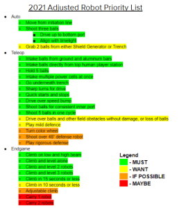 Ever since we knew we would play Infinite Recharge again, we knew a fundamental rebuild of the robot was necessary to significantly boost our performance. So, our design team set out to prepare just that. Starting from a restructured priority list we developed a completely different robot profile to play the game more efficiently.